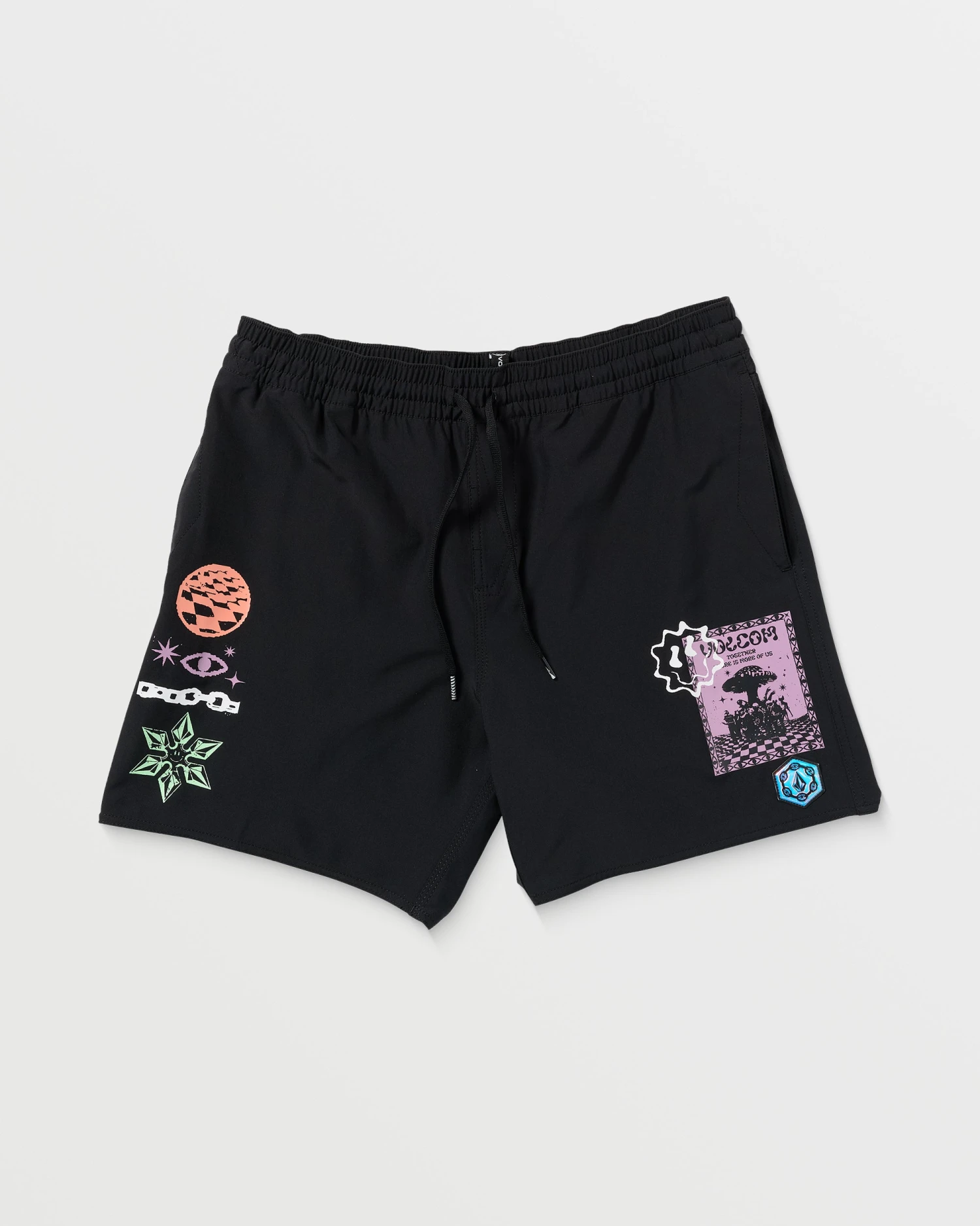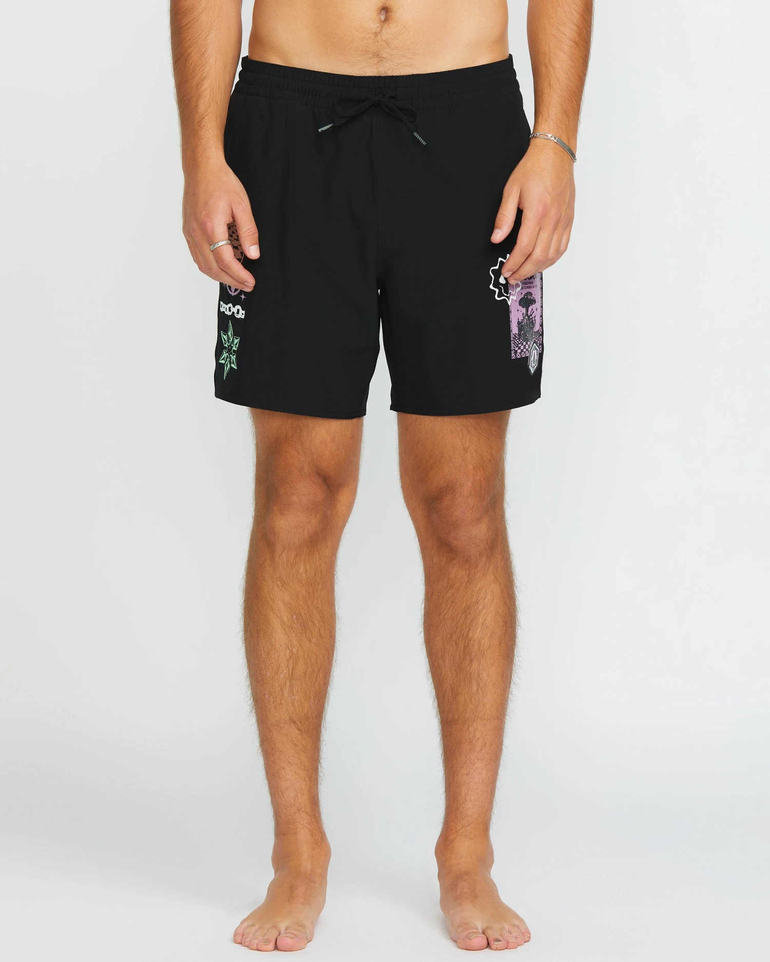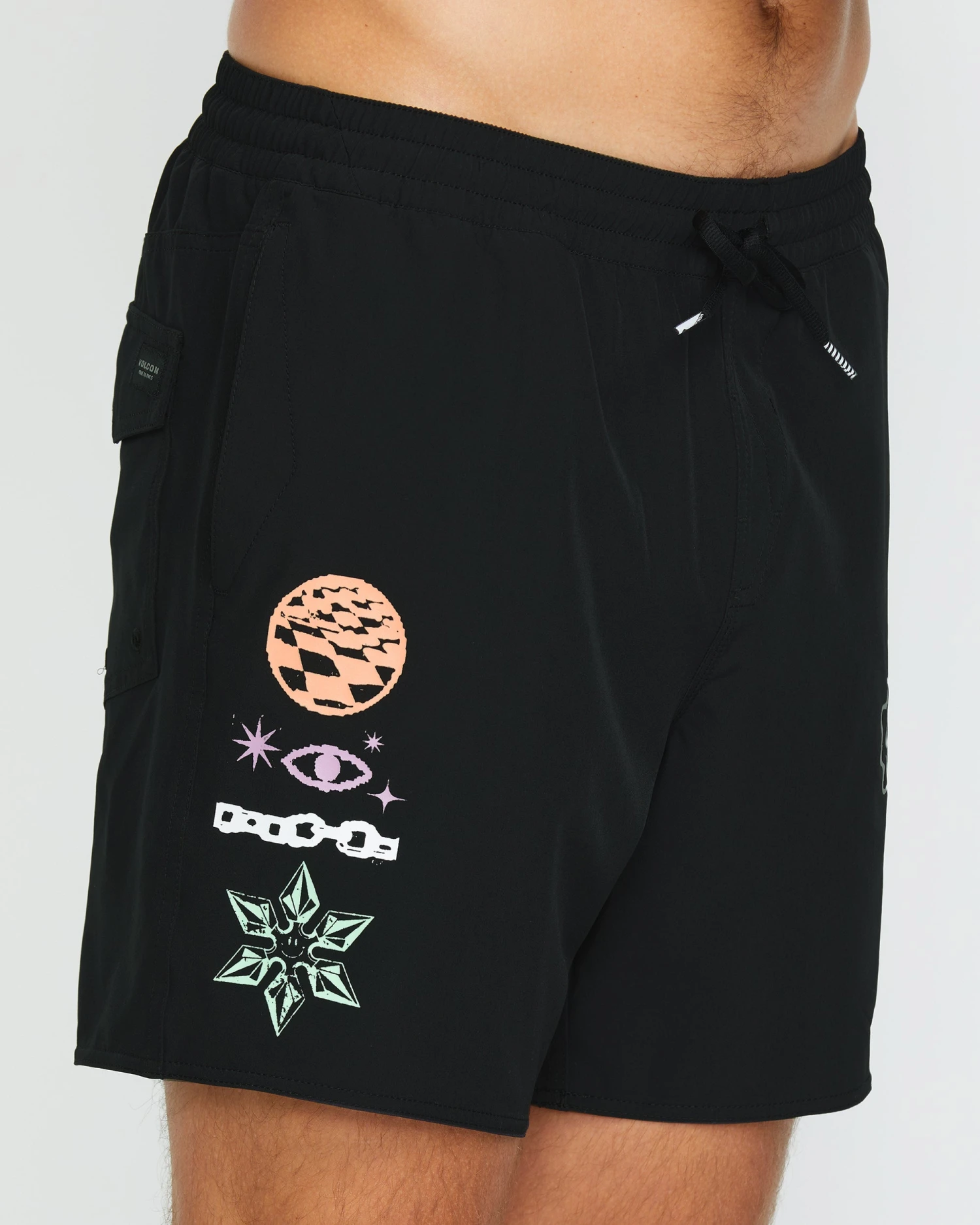 Flex seamlessly in polyester/elastane shorts sporting sporty flap and hand pockets, 7″ inseam, and special edition Rygalski artwork.