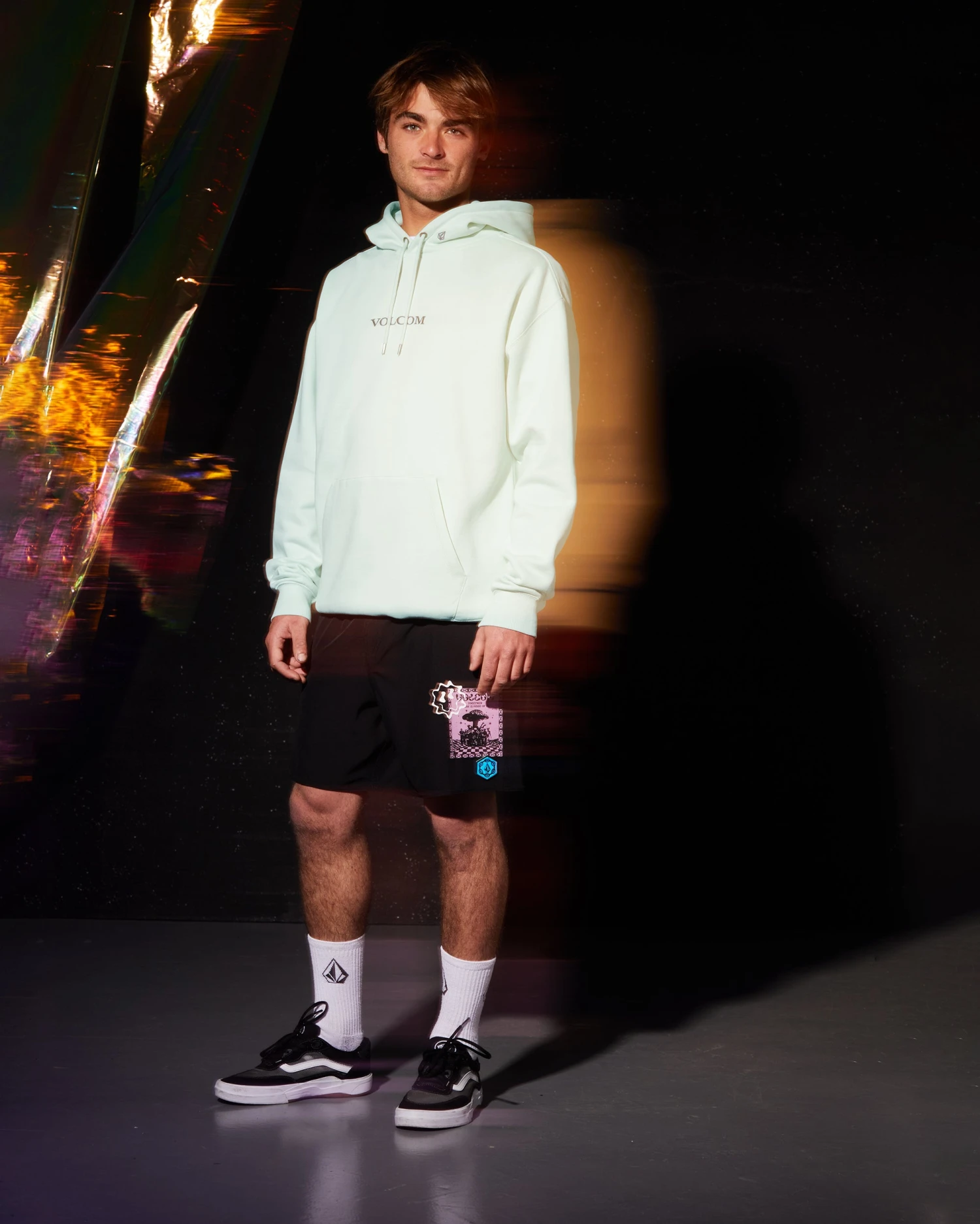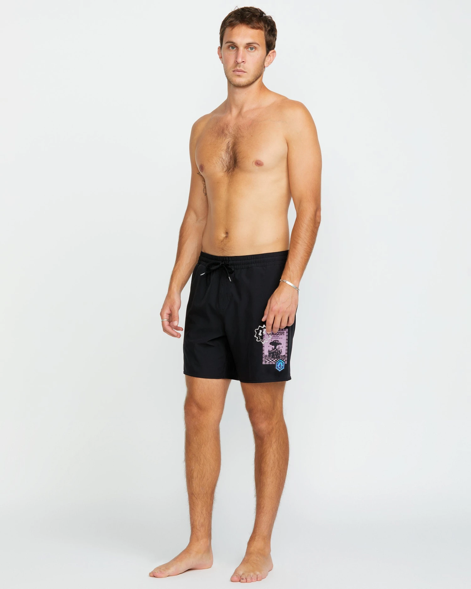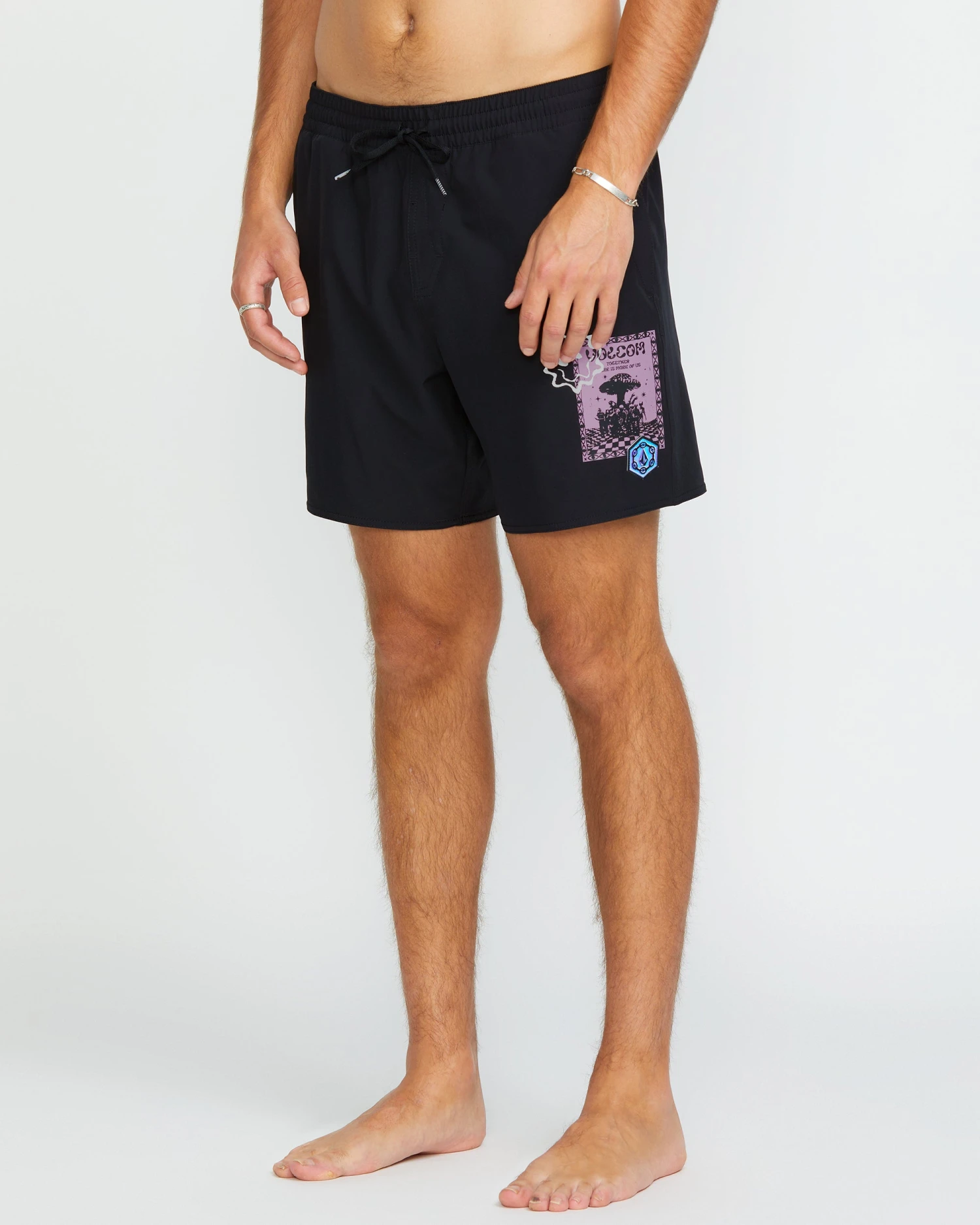 Flex seamlessly in polyester/elastane shorts sporting sporty flap and hand pockets, 7″ inseam, and special edition Rygalski artwork.